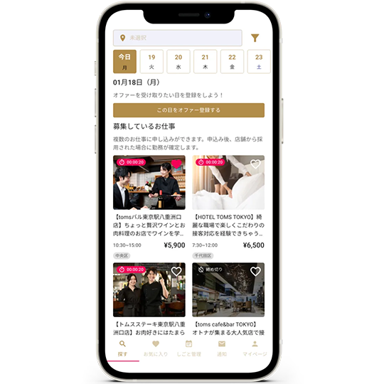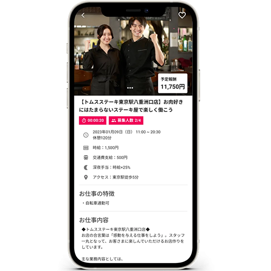 また、「急に人手が足りない」「少しの時間だけ働きたい」といった双方のニーズに応えるため、1日単位・高時給のマッチングを可能にしています。